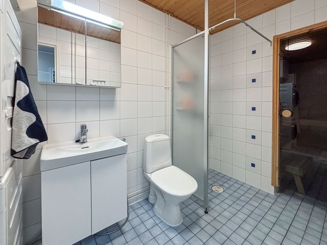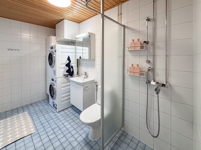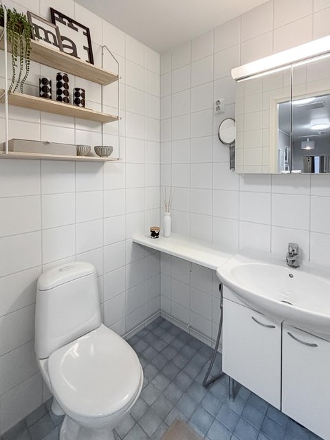 - WC-istuin, suihku, suihkuseinä, pesukoneliitäntä, lattialämmitys, peilikaappi, pesuallas, allaskaappi, ja bidee-suihku