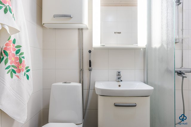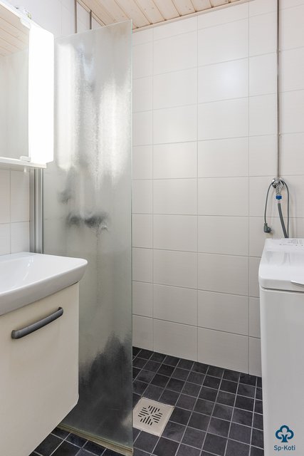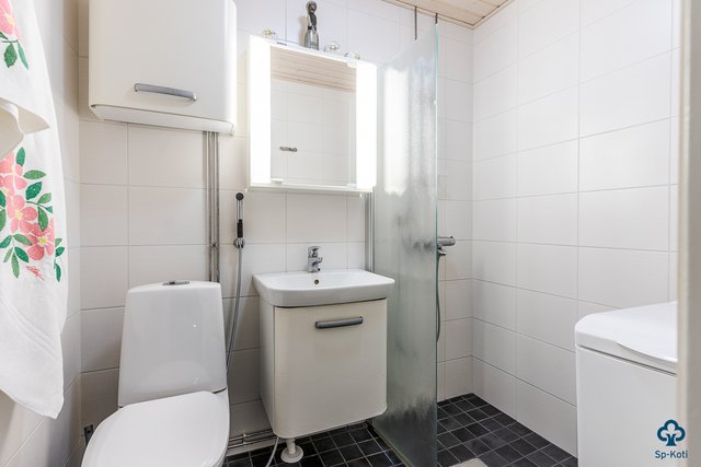 - Kokonaan laatoitettu, lattialämmitys, suihku, suihkuseinä, pesuallas, allaskaappi, kaappi, pesukoneliitäntä, wc-istuin.
