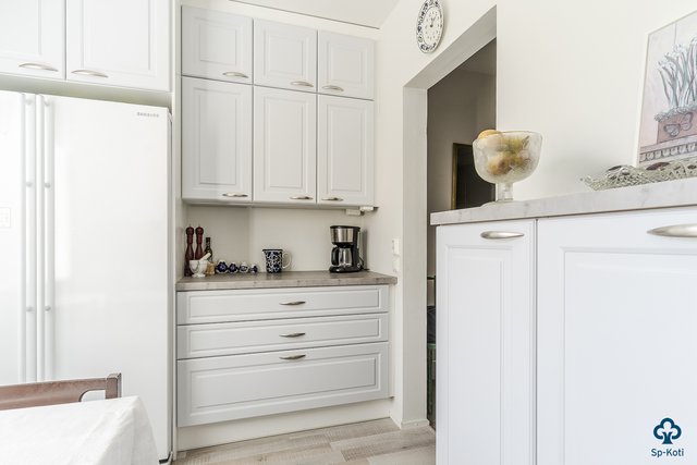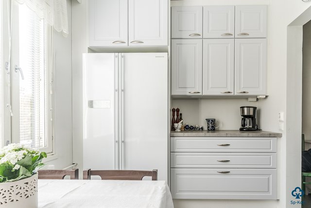 - Kaapistot, side by side kylmiö, liesi, astianpesukoneliitäntä. Lattia muovimattoa.