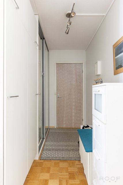 - ETEINEN: SEINÄT: Maali. LATTIA: Parketti. VARUSTUS: Peililiukuovikaappi. (siivouskaappi, pyykkikaappi)