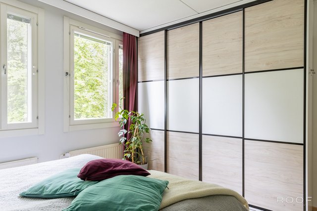 Olohuoneesta on käynti lasitetulle parvekkeelle, joka toimii viihtyisänä lisätilana pitkälle syksyyn. Liukuovikaapit tarjoavat runsaasti säilytystilaa eteisessä sekä kummassakin makuuhuoneissa.