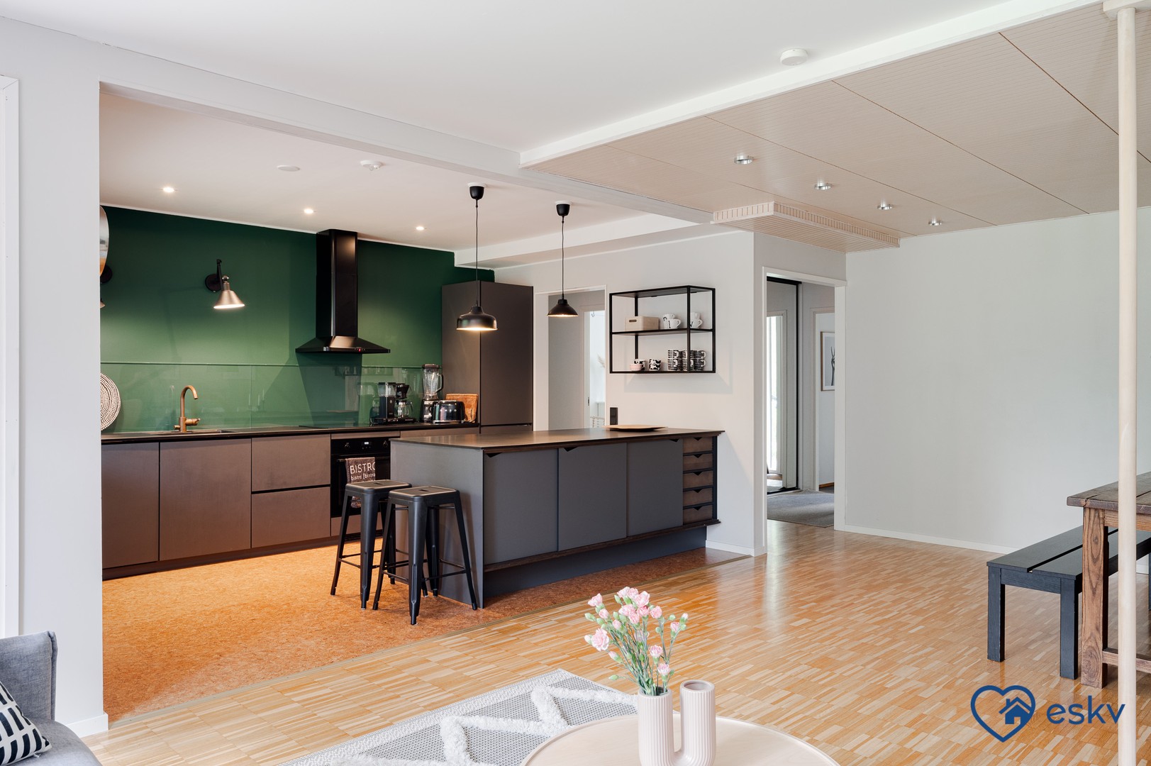 - Moderni avokeittiö yhdistyen olohuoneen ja ruokailutilan kanssa. Keittiö 2019 (Kvik) Varustus: pyrolyysiuuni, induktioliesi, liesituuletin, jääkaappi/pakastin, mikro, astianpesukone (2025), allas ja hana. Keittiön valaisimet. Hyvin kaappi-, ja työskentelytilaa. Lattia korkki, seinät maalattu.