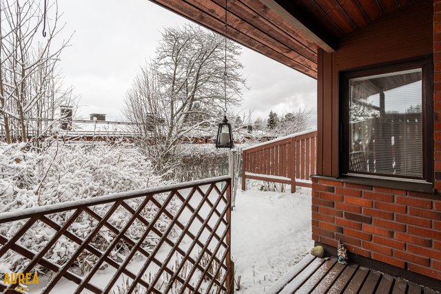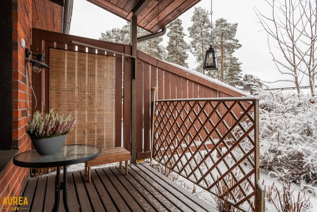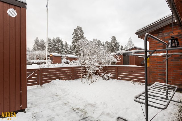 Kylmä varasto sijaitsee huoneiston edessä. Huoneiston kummallekin puolelle jää piha. Pihatilaa onkin huomattavasti enemmän kuin tyypillisessä rivitalokodissa. Olohuoneen puoleiselle pihalle paistaa aurinko pitkälle iltaan asti. Pensasaita tuo yksityisyyttä. Autopistokepaikat vuokrataan taloyhtiöltä.