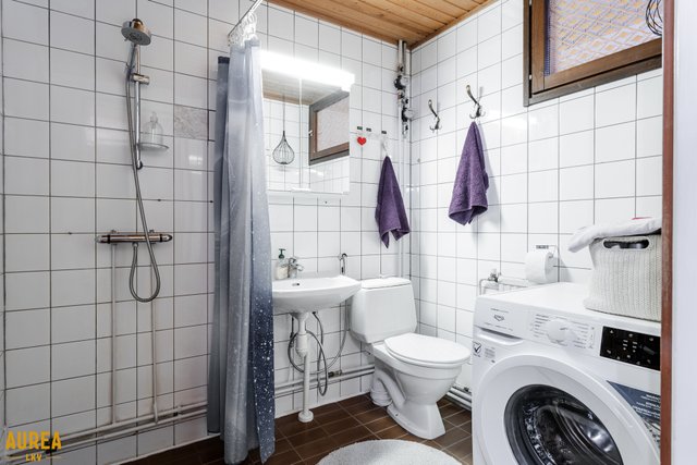 - WC-istuin, suihku, pesuallas, peilikaappi, ja pesukoneliitäntä