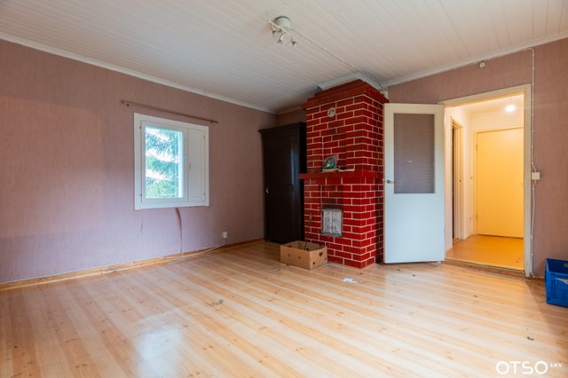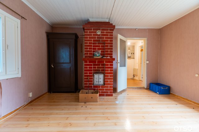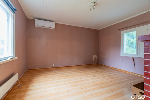 Olohuoneessa on tiilerin varaava takka ja ilmalämpöpumppu.