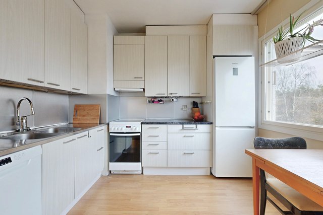 - VARUSTUS: Keraaminenliesi, Liesituuletin, Hana, Kaapisto, Allas, Astianpesukone, Jääkaappipakastin, TASOT: Laminaatti, metalli. SEINÄT: levy välitila. LATTIA: Laminaatti.