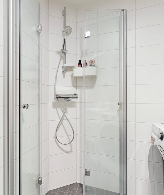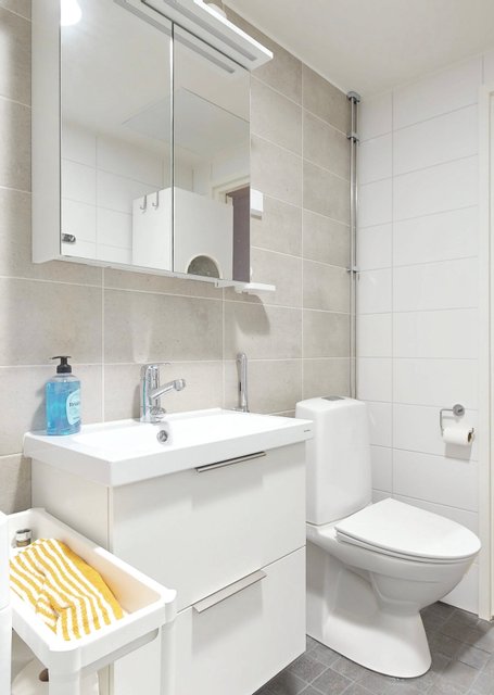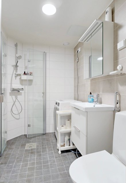 - VARUSTUS: Suihku, Suihkuseinä, WC-istuin, Pesukoneliitäntä, Hana, Allas, Allaskaapisto, Peilikaappi, Lattialämmitys (sähkö). SEINÄT: Kaakeli. LATTIA: Laatta.
