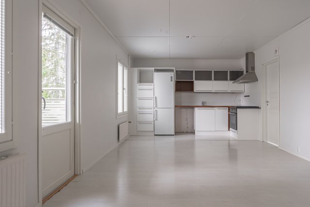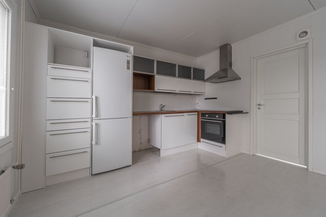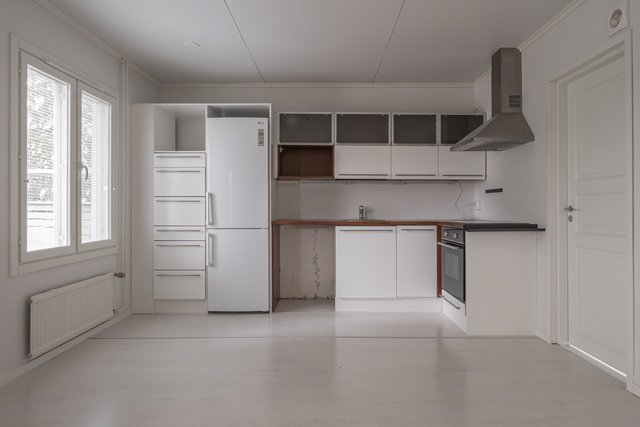- Jääkaappipakastin, liesi (induktio), astianpesukoneliitäntä (varattu paikka astianpesukoneelle), liesituuletin, ja erillisuuni