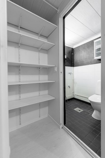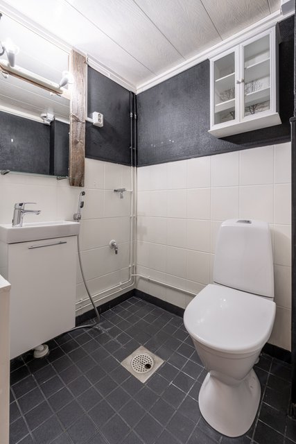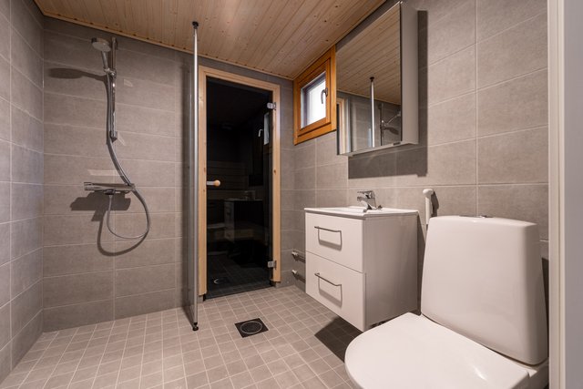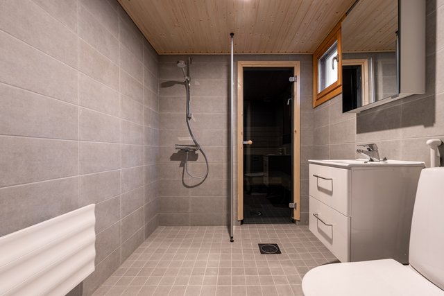 - WC-istuin, suihku, peilikaappi, suihkuseinä, allaskaappi, ja lattialämmitys