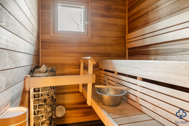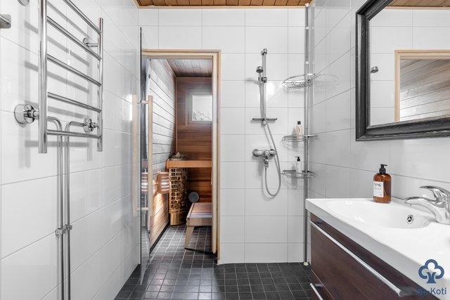 - Yläkerrassa; kokonaan laatoitettu, suihku, pesuallas, allaslaatikosto, peili, kaappi, pesukoneliitäntä, wc-istuin, lattialämmitys. Remontoitu 2017.