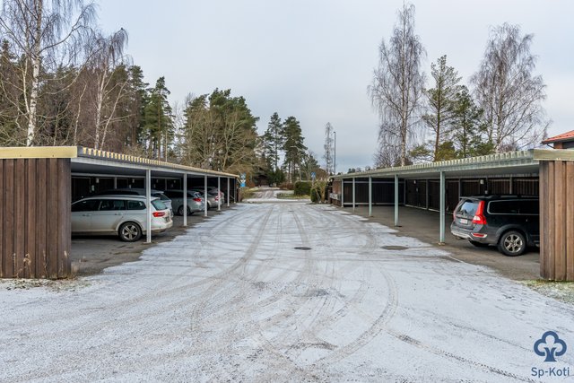 Ulko-oven vieressä on oma varasto ja asuntoon kuuluu myös autokatospaikka, joka helpottaa arkea erityisesti talvikuukausina.
