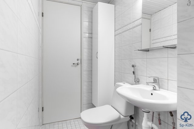- Alakerrassa; kokonaan laatoitettu, pesuallas, kaappi, peili, wc-istuin.