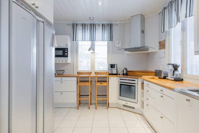 - Jääkaappi, erillinen pakastin, astianpesukone, liesituuletin, liesi (yksi levy ei toimi), erillisuuni, ja mikroaaltouuni