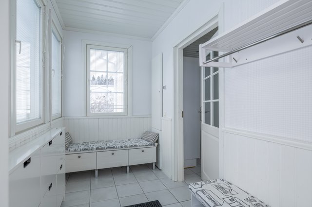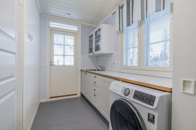- Pesukoneliitäntä, lattialämmitys, lattiakaivo, keskuspölynimuri, pöytätaso, kuivauskaappi, pesuallas, ja lämminvesivaraaja