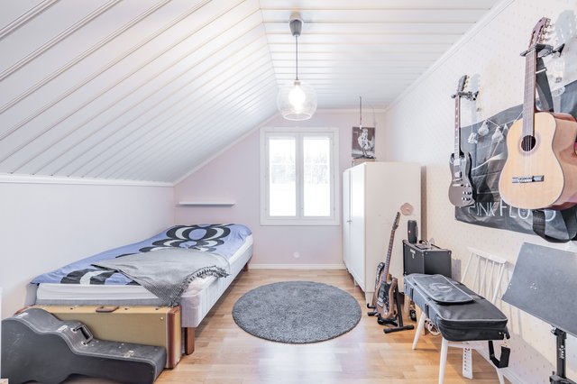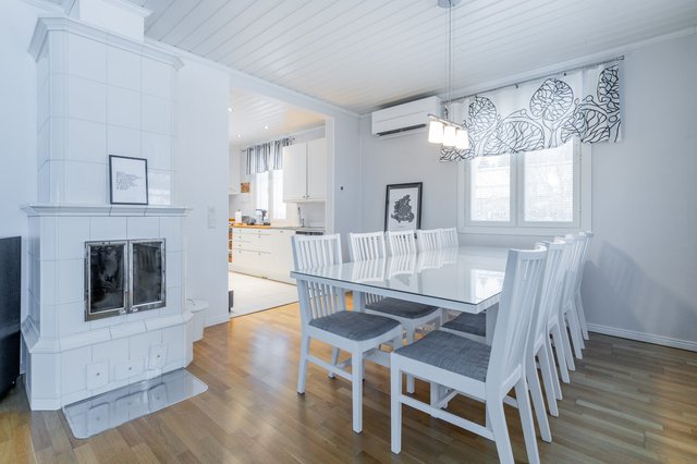 Kodin sydämenä toimii lämpöä varaava takka, joka tuo tunnelmaa ja säästöä lämmityskustannuksiin. Kaksikerroksisessa talossa on neljä makuuhuonetta, joten tilaa riittää isommallekin perheelle. Keittiö on varustettu nykyaikaisilla laitteilla, ja iso ruokailutila yhdistyy valoisaan olohuoneeseen. Sauna ja tilava kylpyhuone takaavat rentouttavat hetket arjen keskellä.