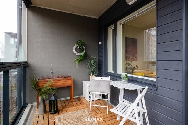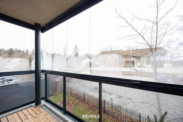 Suurikokoinen lasitettu parveke toimii viihtyisänä lisätilana keväästä syksyyn – täydellinen paikka aamukahville tai rentoon oleskeluun.