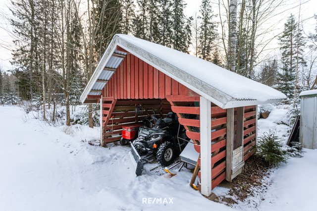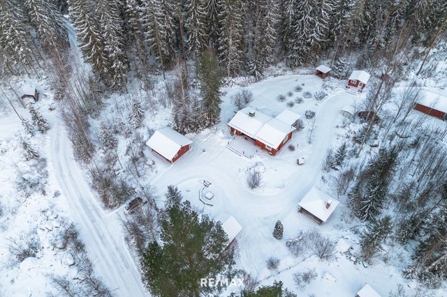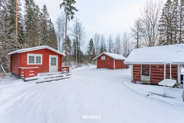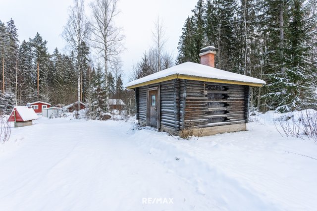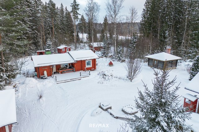 - Ei tarkistusmitattu. Pinta-alat saattavat tämän ikäisissä kohteissa (rekisteröity ennen 01.01.1992) poiketa olennaisestikin asuinrakennusten nykyisten mittaustapojen ja standardien (SFS 5139) mukaan laskettavasta asuintilojen pinta-alasta. Pinta-ala voi siis olla edellä mainittua pienempi tai suurempi. Pinta-alat on 3D-mallinnoksesta ja rakennuspiirustuksista laskettu suuntaa-antavasti. Asuinneliöihin on laskettu keittiö, tupa, alkovi, pukuhuone, vaatehuone, kylpyhuone ja sauna. Muut tilat käsittävät lämpimien varastotilojen ja vierasmökin pinta-alat suuntaa-antavasti.