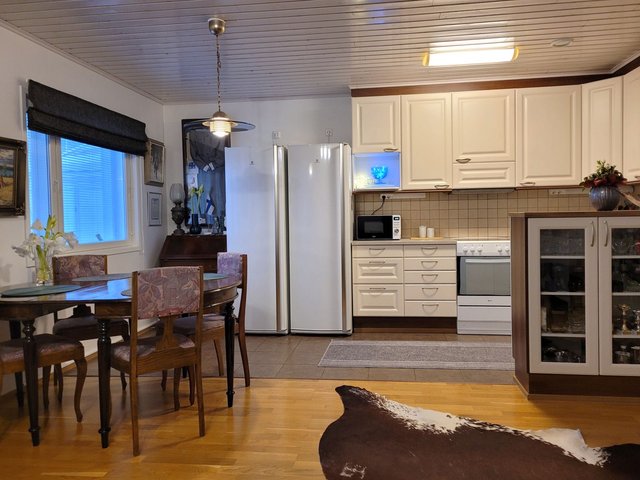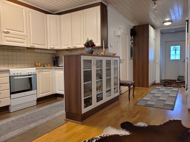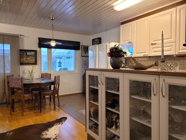 - Kaunis lasiovivitriinillä viimeistelty keittiö. Tasot ja allas uusittu 2024, "pata/kattilakaapisto" 2023