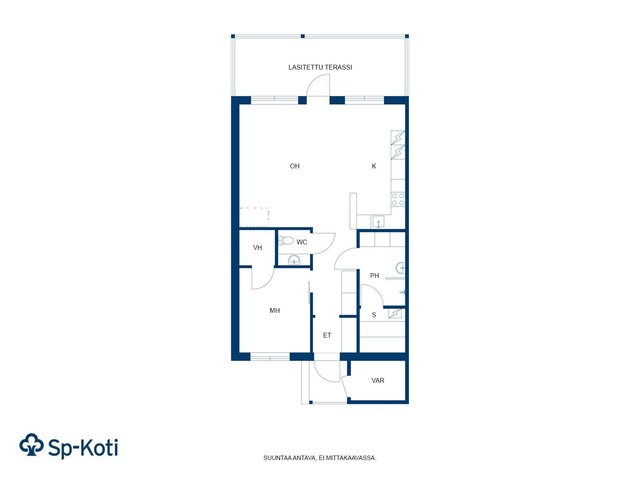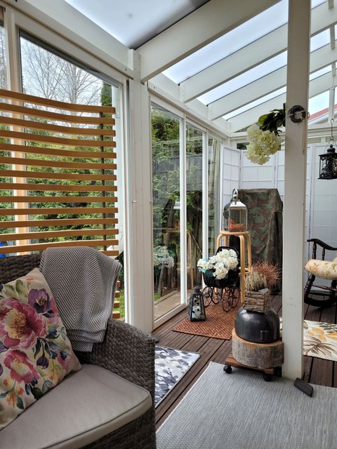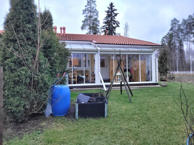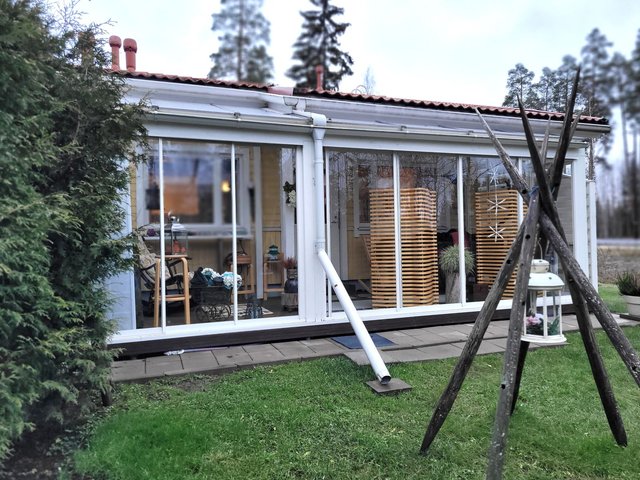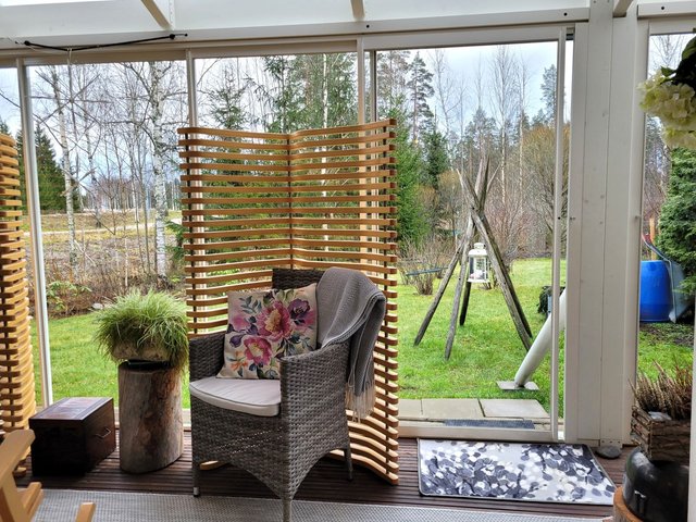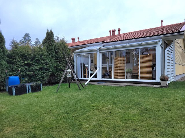 Avaran olohuoneen jatkeena on lasitettu terassi, joka toimii erinomaisena lisähuoneena aikaisesta keväästä myöhäiseen syksyyn. Terassin edustalla avautuu suojaisa ja helposti hoidettava oma piha, jossa nautit omasta rauhasta ilman läpikulkua.