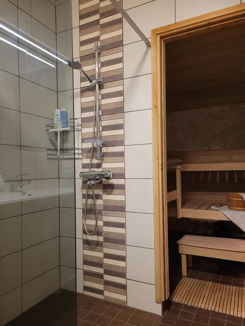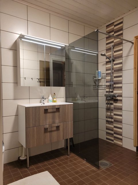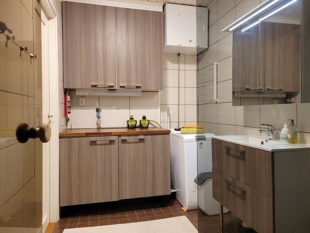 - Suihku, suihkuseinä, pesukoneliitäntä, lattialämmitys, peilikaappi, pesuallas, allaskaappi, ja kodinhoitotaso ja -kaapit
