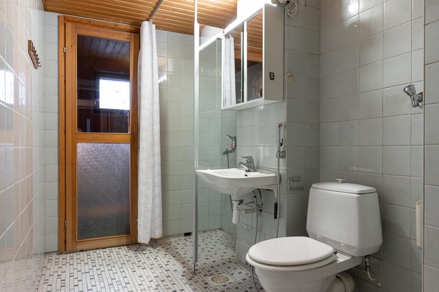 - Varustus: pesuallas, wc-istuin, bidee. Suihku. Pesukoneliitäntä. Pesuhuonetta remontoitu 1990-luvun loppupuolella, jolloin lattialaatoitus tehty vanhan muovimaton päälle. Bideesuihku on laitettu jälkeenpäin. Kaikkiin yhtiön kylpyhuoneisiin on tehty 2016 tarkastus, jossa yleismainintana todettiin, että vedeneristeenä muovimaton toiminta on jo teknisesti päättynyt. B 8 asunnon mittauksissa ei silloin todettu kosteutta. Lattiassa on sähkötoiminen lattialämmitys.