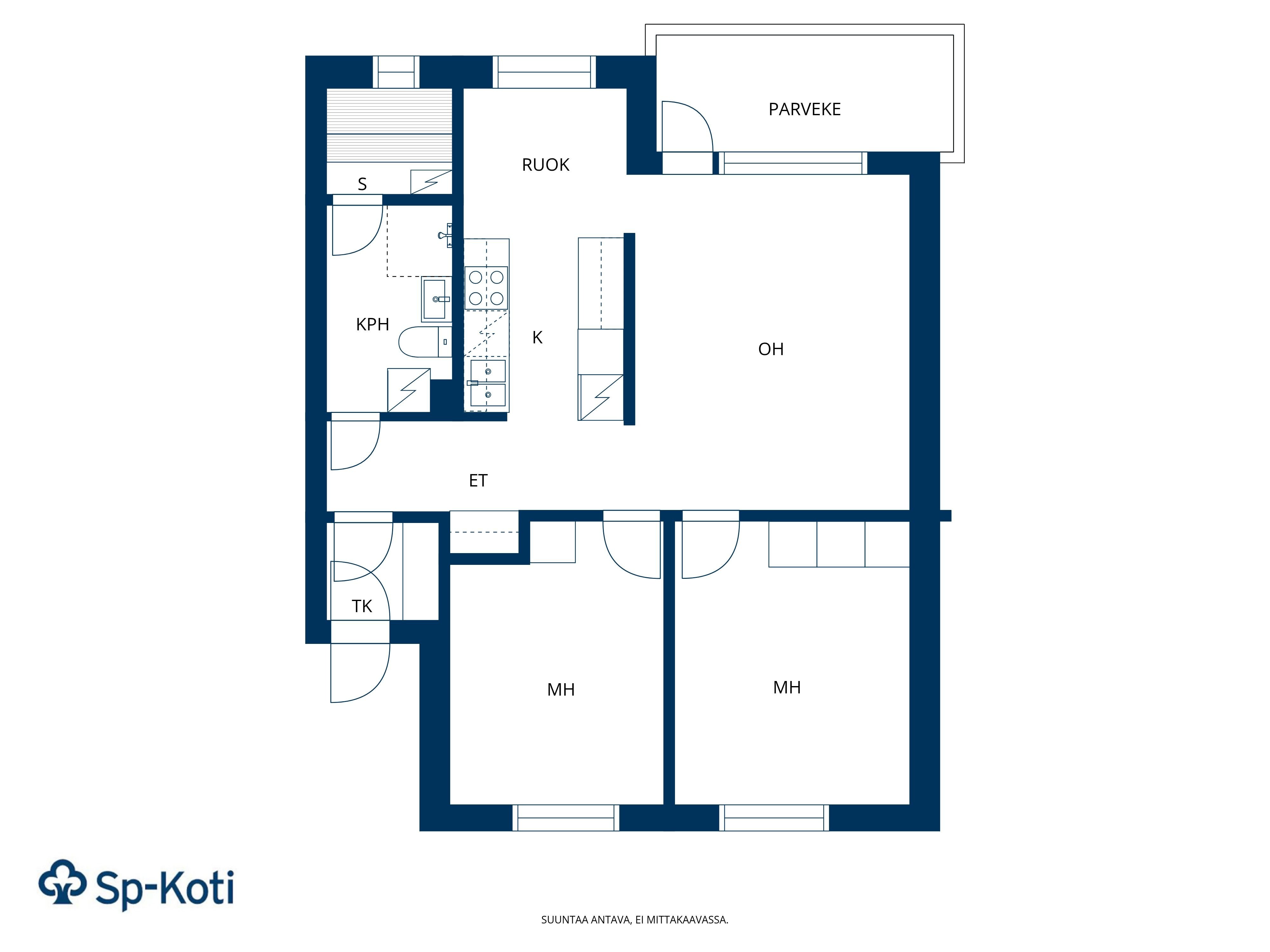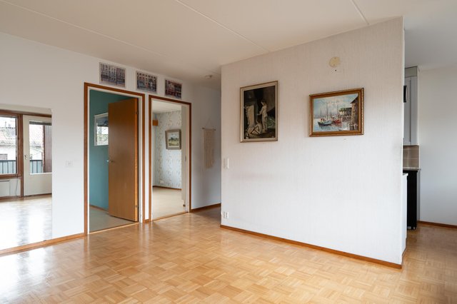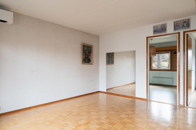 - Olohuoneen ikkunat n. länteen. Olohuoneesta on käynti parvekkeelle. Lattia mosaiikkiparketti ja seinät tapetoitu.