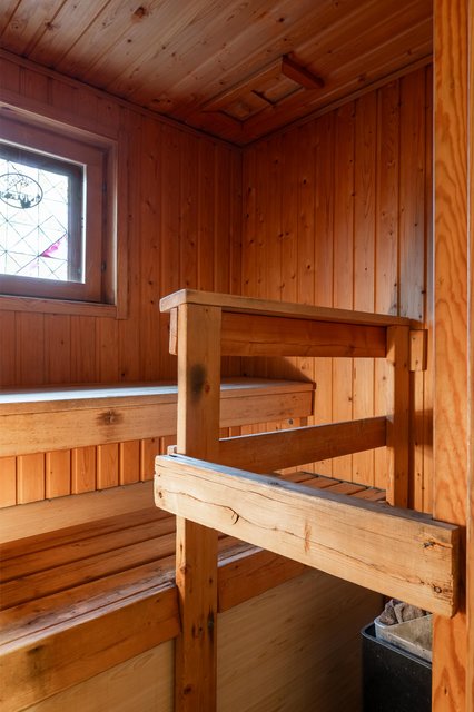 - Saunassa on ikkuna. Vesivaraaja on saunan lauteiden alla; tarkastusluukku sinne on keittiön ruokailutilasta.