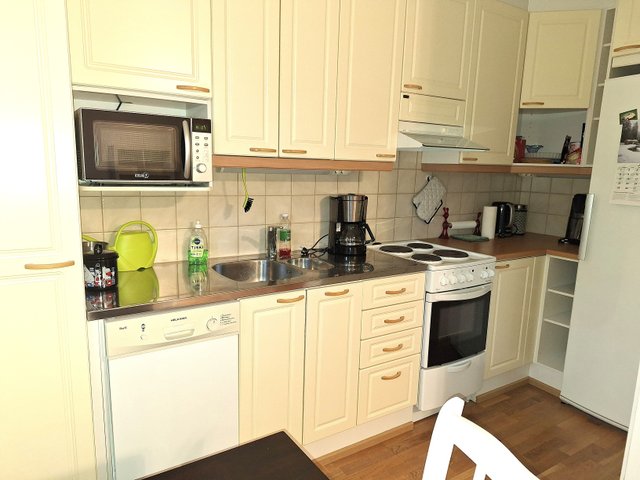 - Jääkaappi, jää-viileäkaappi, liesituuletin, mikroaaltouuni, astianpesukone, ja liesi