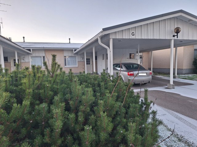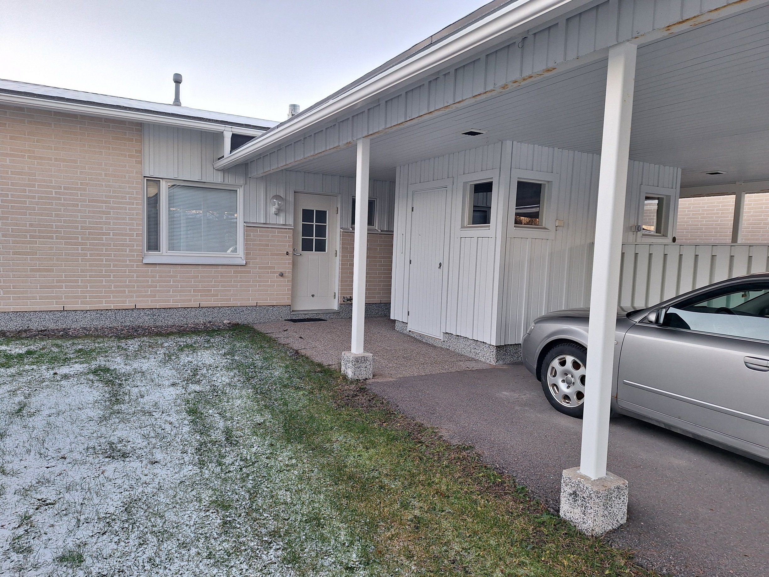 Asunnon yhteydessä on oma autokatos, joten liikkeelle pääsee helposti ilman lumenharjausta. Autokatoksen