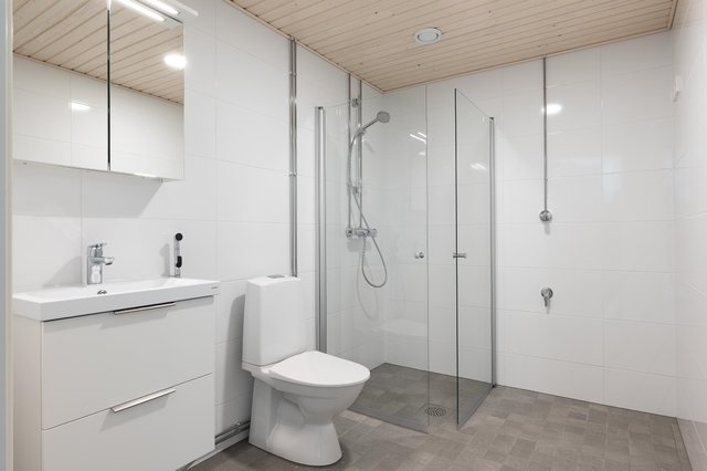- WC-istuin, suihku, suihkuseinä, pesukoneliitäntä, allaskaappi, pesuallas, peilikaappi, ja bidee-suihku