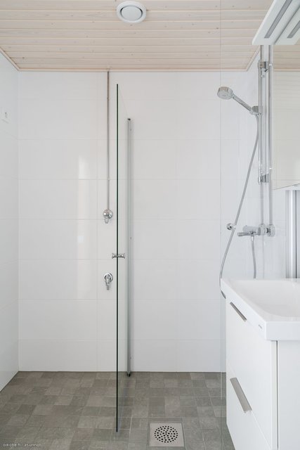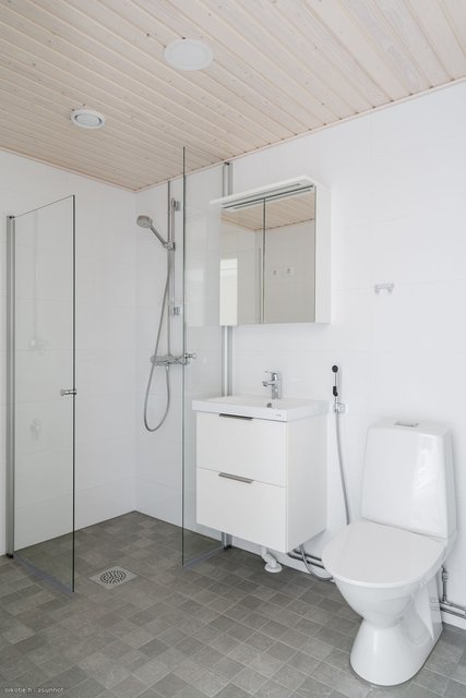 - WC-istuin, suihku, suihkuseinä, pesukoneliitäntä, peilikaappi, pesuallas, allaskaappi, lattialämmitys, ja bidee-suihku