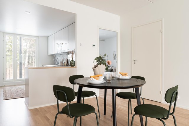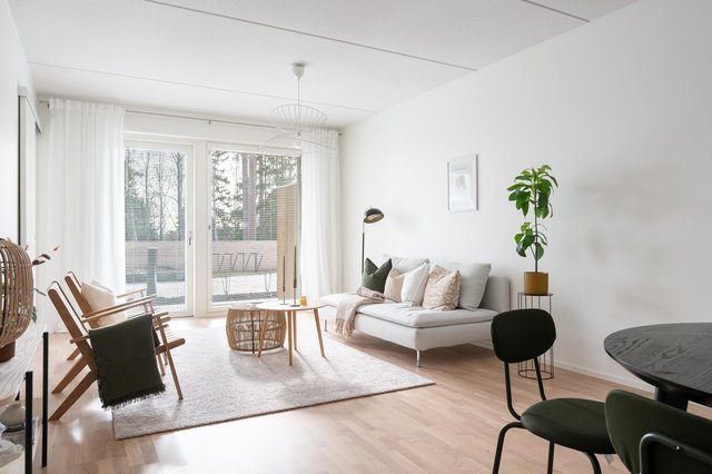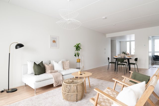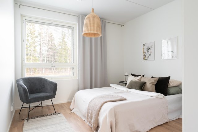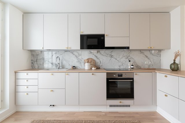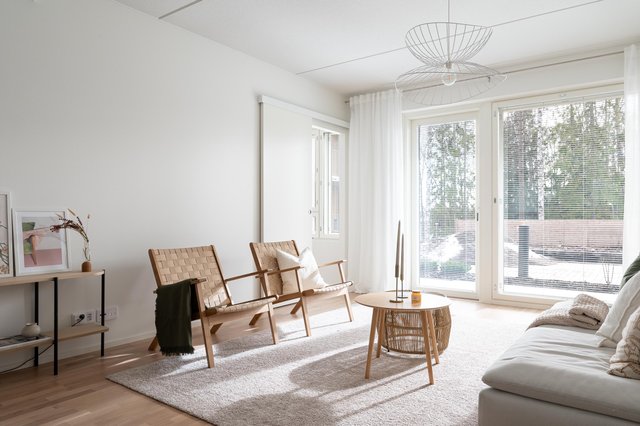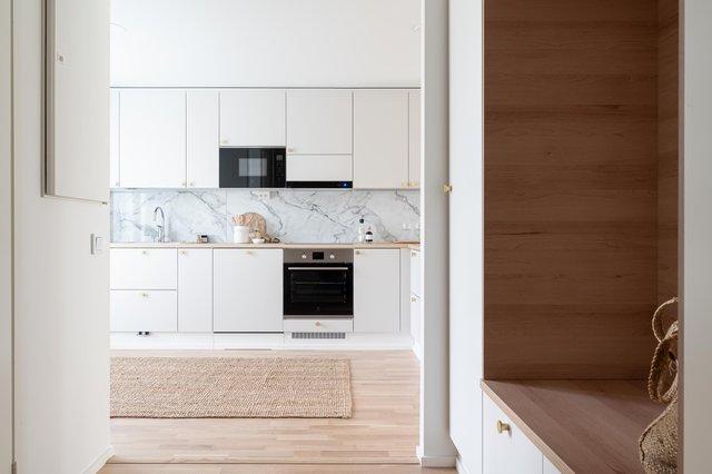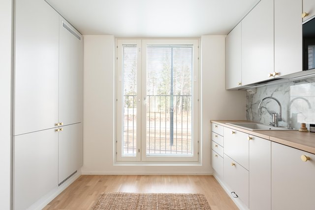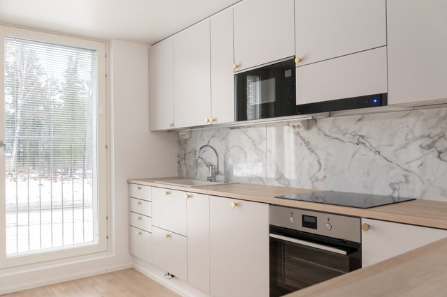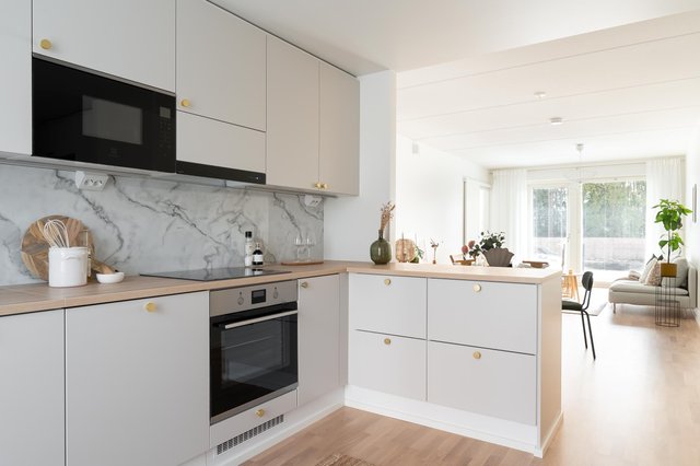 Erittäin kaunis läpitalon asunto, jonka materiaalit hurmaavat. Kaunis, lämminsävyinen keittiö on viimeistä piirtoa myöten mietitty: koneet on integroitu kalusteovin ja mikroaaltouunikin kuuluu kalustukseen. Aamiaiskaapissa säilytät kahvinkeittimen ja aamuhetken tykötarpeet. Kaapistojen jatkeeksi on rakennettu saareketaso, joka on sekä kiva tilanjakaja että toimii kokin apuna. Pehmeä värimaailma jatkuu kylpyhuoneessa ja erillisessä wc::ssä. Tähän kotiin et voi olla ihastumatta!