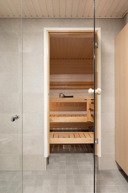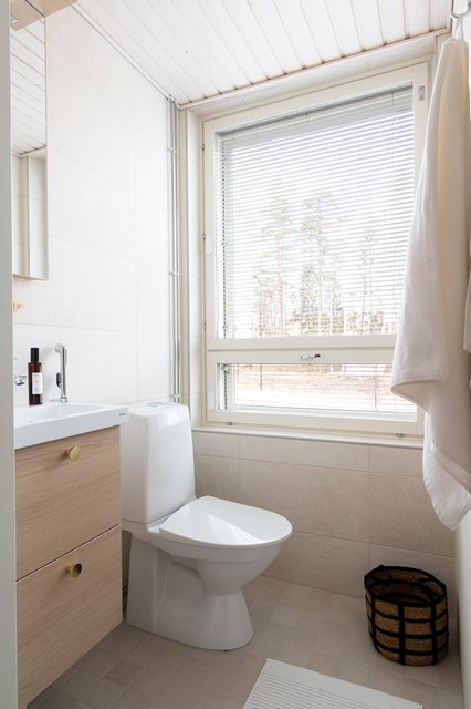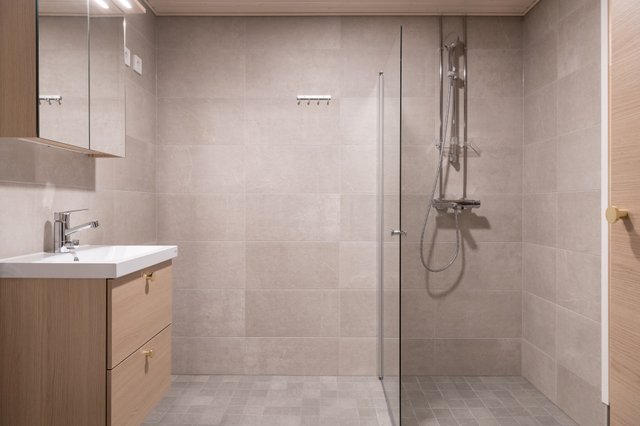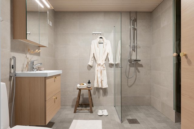 - WC-istuin, suihkuseinä, suihku, pesukoneliitäntä, lattialämmitys, pesuallas, peilikaappi, allaskaappi, ja bidee-suihku