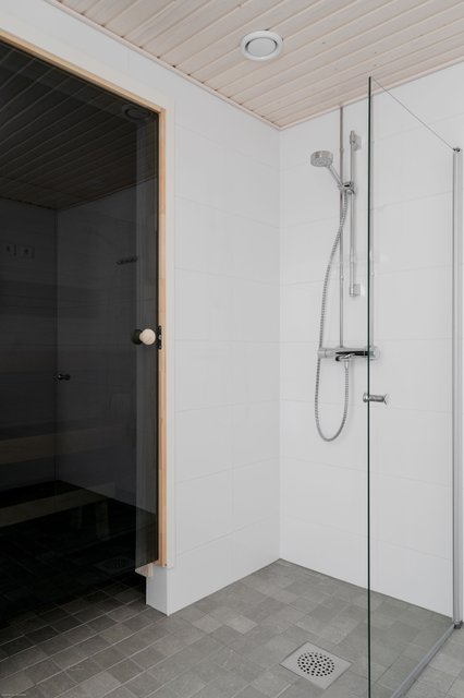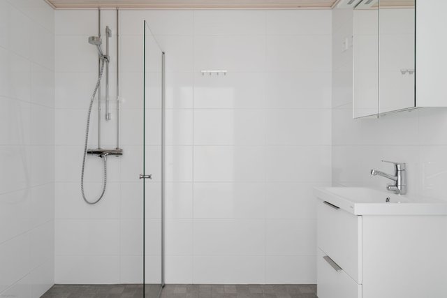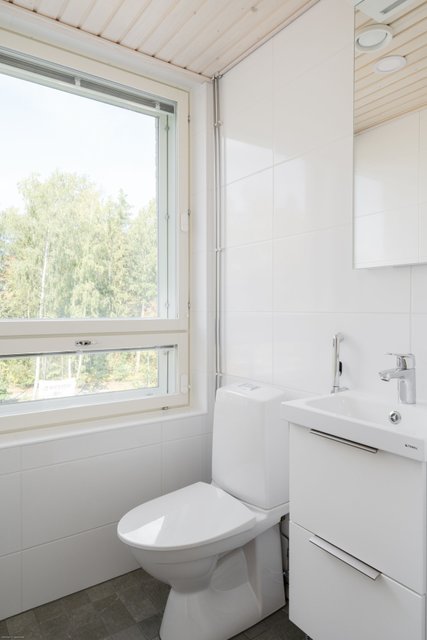 - WC-istuin, suihku, suihkuseinä, pesukoneliitäntä, allaskaappi, pesuallas, peilikaappi, lattialämmitys, ja bidee-suihku