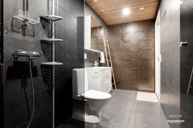 - WC-istuin, suihku, allaskaappi, pesuallas, ja peilikaappi