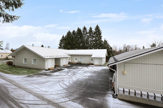 - Tilava kiinteistö. Terassien puolella ja rakennuksen päädyssä nurmikko. Sisäpiha ja autokatokset asfaltoitu. Pihatien varressa vieraspaikkoja autoille.
