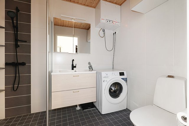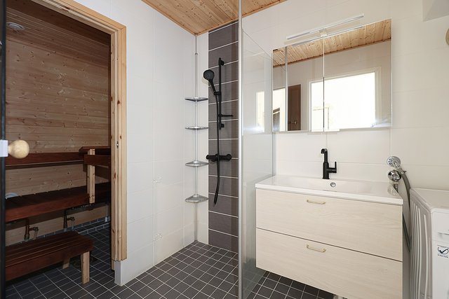 - WC-istuin, suihku, suihkuseinä, pesukoneliitäntä, lattialämmitys, pesuallas, allaskaappi, ja lisätty säilytyskaapisto