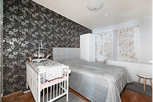 - Parkettilattia, maalatut ja tapetoidut seinät, katossa MDF-paneeli.