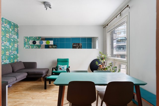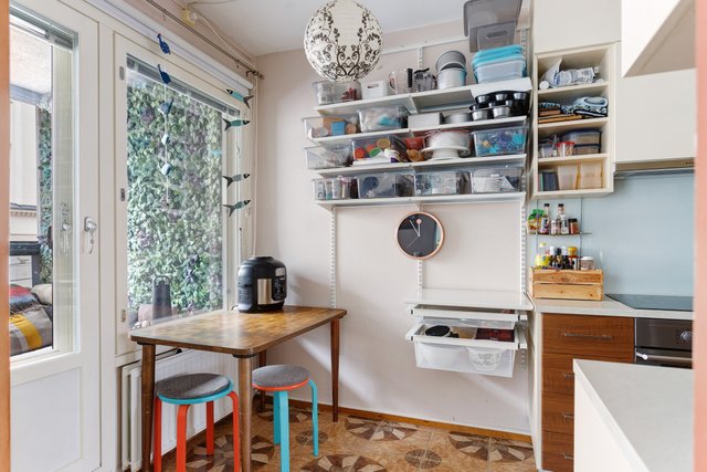 - Keittiön avohyllyt asennettu 2024, voivat kuulua kauppaan tai voidaan poistaa. Parvekkeen seinällä olevat viherkasvit (muovia) ja lattialaatat (muovia) voivat jäädä tai voidaan poistaa.