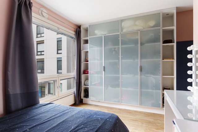 - Makuuhuoneista näkymät taloyhtiön rauhalliselle sisäpihalle. Makuuhuoneissa on kaapistot.
