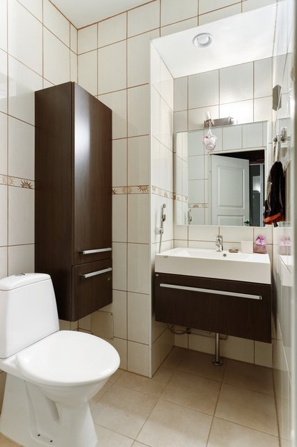 - Erillisessä WC:ssä on peili- ja allaskaappi. Bidee-suihku. WC-istuin. Seinäkaappi.