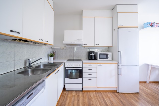 - Jääkaappipakastin, astianpesukone, keittiösaareke, liesituuletin, liesi, ja uuni