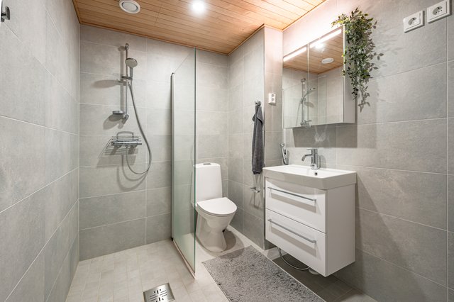 - - WC istuin - Suihku - Suihkuseinä - Allaskaappi - Peilikaappi - Käsisuihku - Pesukoneliitäntä Lattia ja seinät laatoitettu