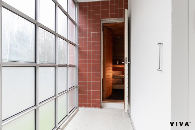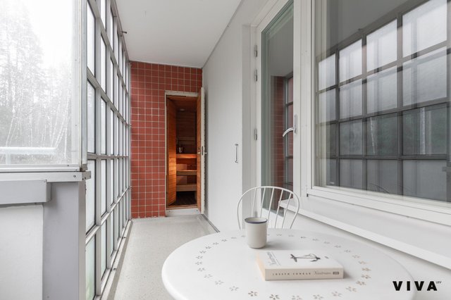 Asunnon pohjaratkaisu on toimiva ja tilava, mukavana lisänä oma sauna, josta käynti terassille. Olohuoneen yhteydessä on keittiö, makuuhuoneita on kaksi ja kylpyhuoneeseen mahtuu myös pyykinpesukone.