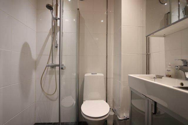 - Kylpyhuone on tyylikäs ja säilytystilaa on peilikaapissa ja allaskaapissa. VARUSTEET: allaskaappi, peilikaappi, suihkuseinä, suihku, wc-istuin, pesukoneliitäntä. LATTIA: laatta SEINÄT: laatta