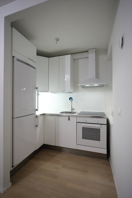 Keittiössä on modernit kiintokalusteet ja kodinkoneet. Huonetila on tyylikäs ja valoisa. Laatoitetussa kylpyhuoneessa on mukavasti säilytystilaa sekä paikka pesukoneelle.