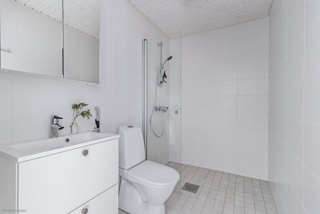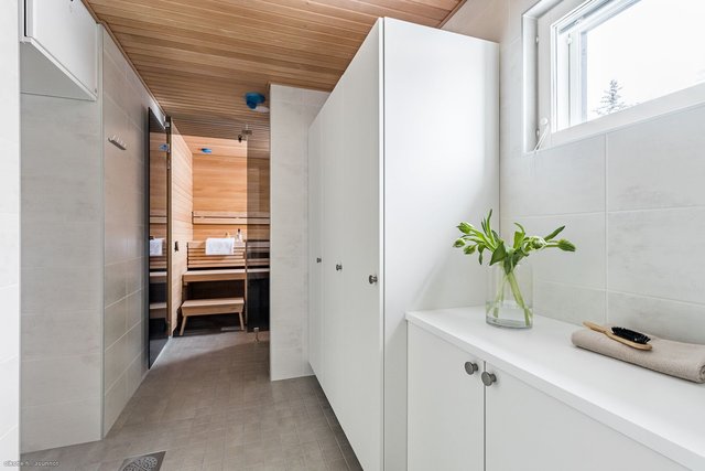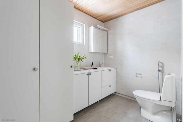 - WC-istuin, suihku, pesukoneliitäntä, allaskaappi, bidee-suihku, ja peili