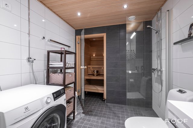 Kylpyhuone on tilava, ja sinne mahtuu hyvin pesukone. Kylpyhuoneen yhteydessä on oma sauna, joka kutsuu rentoutumaan päivän päätteeksi. Asunnon kokonaisuutta täydentää valoisa ja rauhallinen tunnelma.