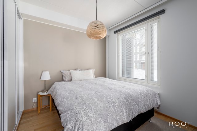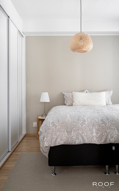 Asunnossa on kaksi makuuhuonetta, joista molemmissa on kaapistot säilytystä varten. Eteinen jatkaa samaa linjaa tarjoten lisää kaappitilaa.
