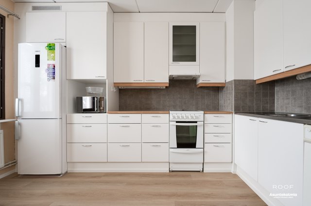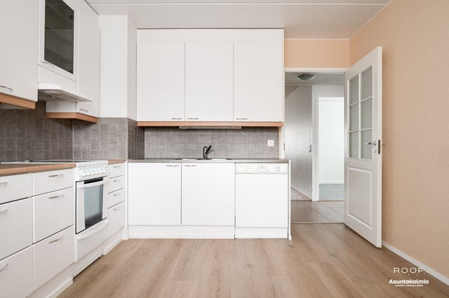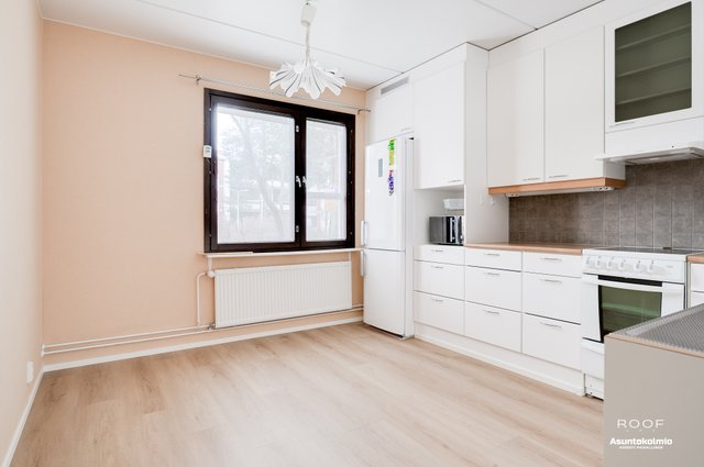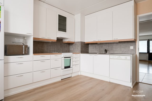 - Varustus: Jääkaappi/pakastin, keraaminen liesi, liesituuletin, mikroaaltouuni, astianpesukone, laminaattitasot. Keittiön kaapistoja ja lattia uusittu 2023.
